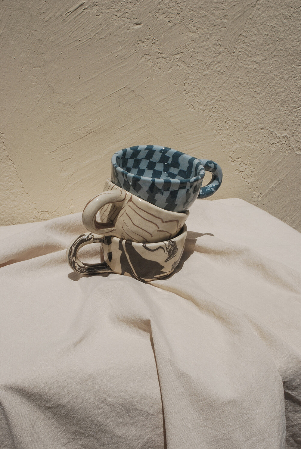 A handmade mug that demonstrates various patterns with soil of two or three colours. It gives a thicker and warmer feeling than a normal marble mug.